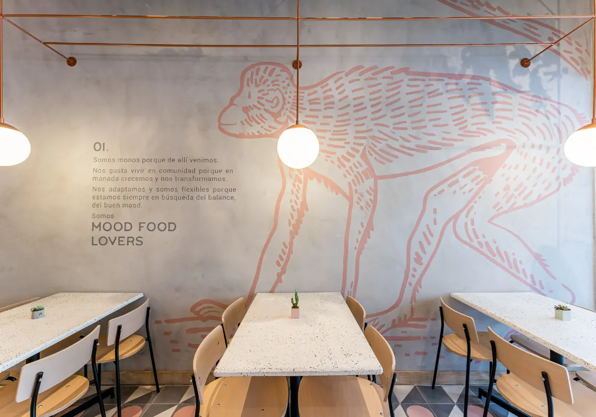 Para contar la historia de la marca, el equipo de Plasma Nodo integró elementos gráficos que son pura personalidad. Los murales de monos, el manifiesto pintado en la pared y los letreros de neón no son solo decoración, sino el corazón de la identidad de Limona, dándole un carácter inolvidable al lugar.